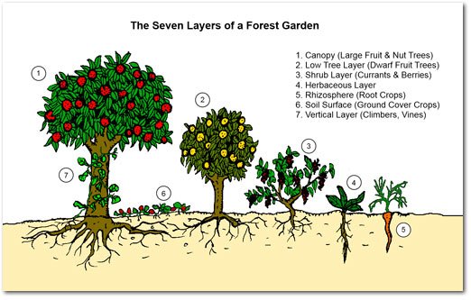 Šumski vrt se sadi planski i gotovo sve biljke u njemu imaju prehrambenu ili neku drugu vrijednost za vas, a one ostale biramo kao podršku i zaštitu biljkama koje primarno želimo uzgajati. U šumskom vrtu prostor se ne koristi samo horizontalno nego i vertikalno, a biljke se raspoređuju tako da popunjavaju vertikalne slojeve, točnije njih 7. Ponekad se dodaje još slojeva kao što su na primer vodene biljke (ako se u sklopu šumskog vrta nalazi i neki potok ili jezerce), te gljive. Ispod visokih (postoječih) stabala sade se voćke ispod kojih rastu srednje visoki grmovi, uz njih nisko grmlje, ispod njih na primjer šumske jagode, a na voćku se penje penjačica. Sadi se i cvijeće te ostalo ukrasno bilje koje osim estetike ima i funkciju lakšeg suzbijanja štetnika i bolesti.